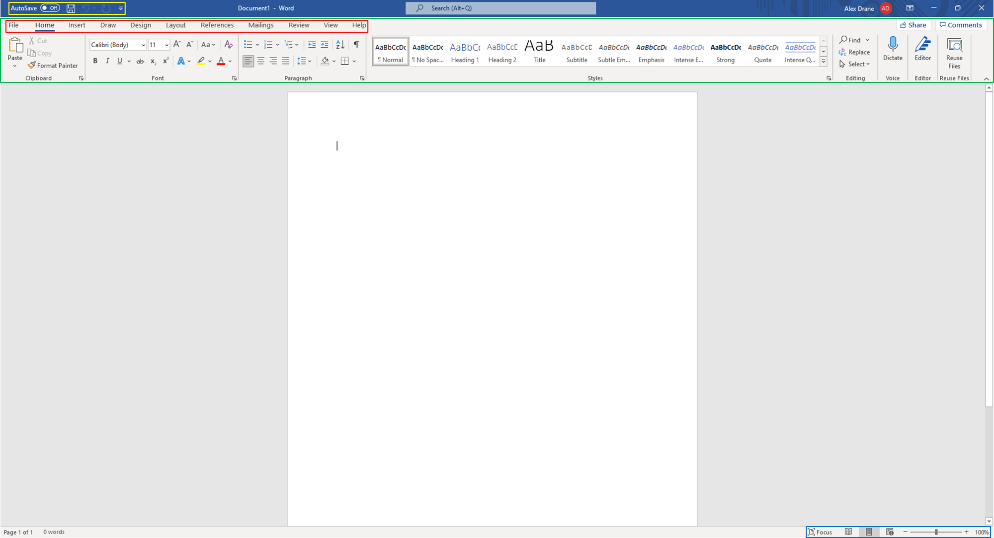 When you first open your word document you are greeted by the “Home” tab. This has the basic tools for editing your word document (font, text size, text colour, text layout, text templates and much more). The other tabs are: File, Insert, Draw, Design, Layout, References, Mailings, Review, View and Help.