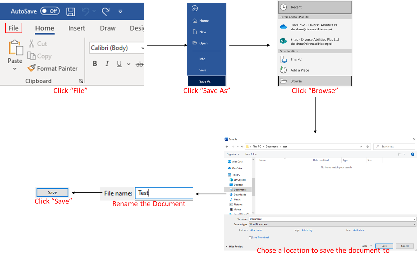 1st - Manually Saving - Click the File Tab > click Save As > Click “Browse” > Choose a location > Rename the file > Click “Save”
