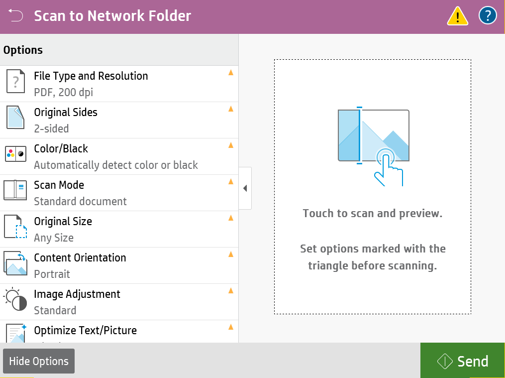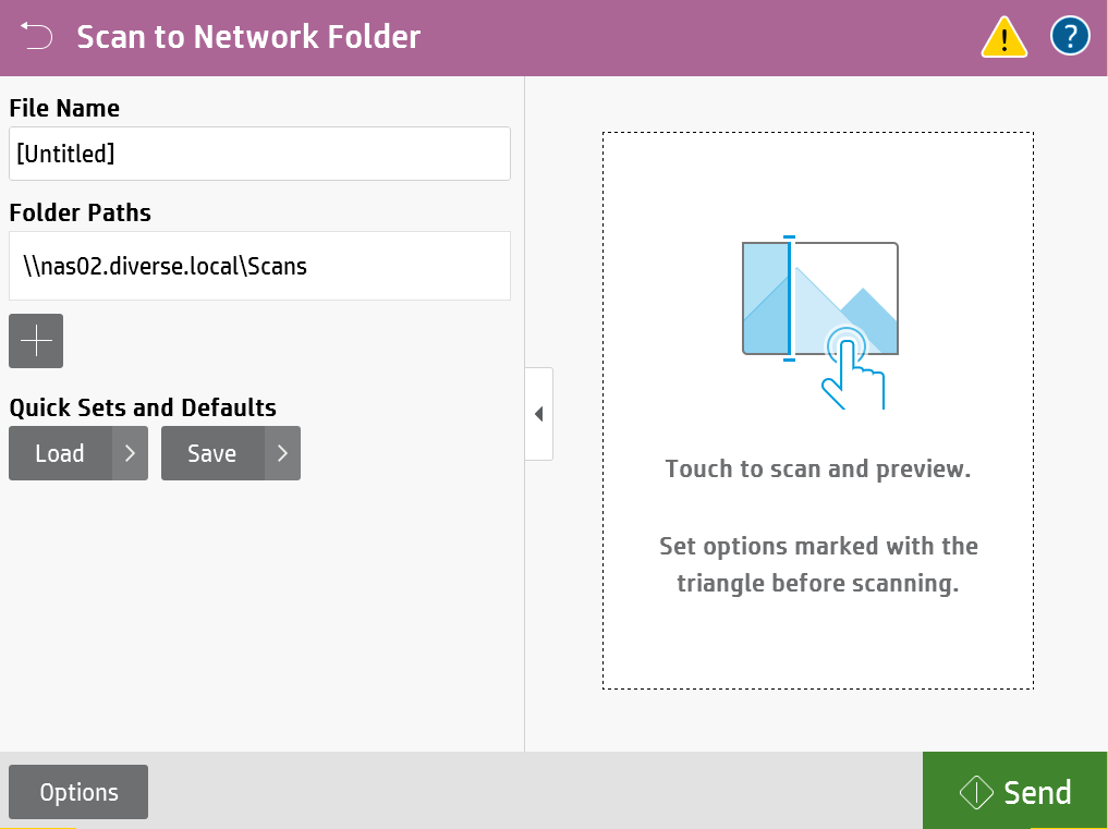 Pressing Options in the bottom left, here you are able to set the options for your scan, double or single sided, black and white or colour, and the quality of the scan.